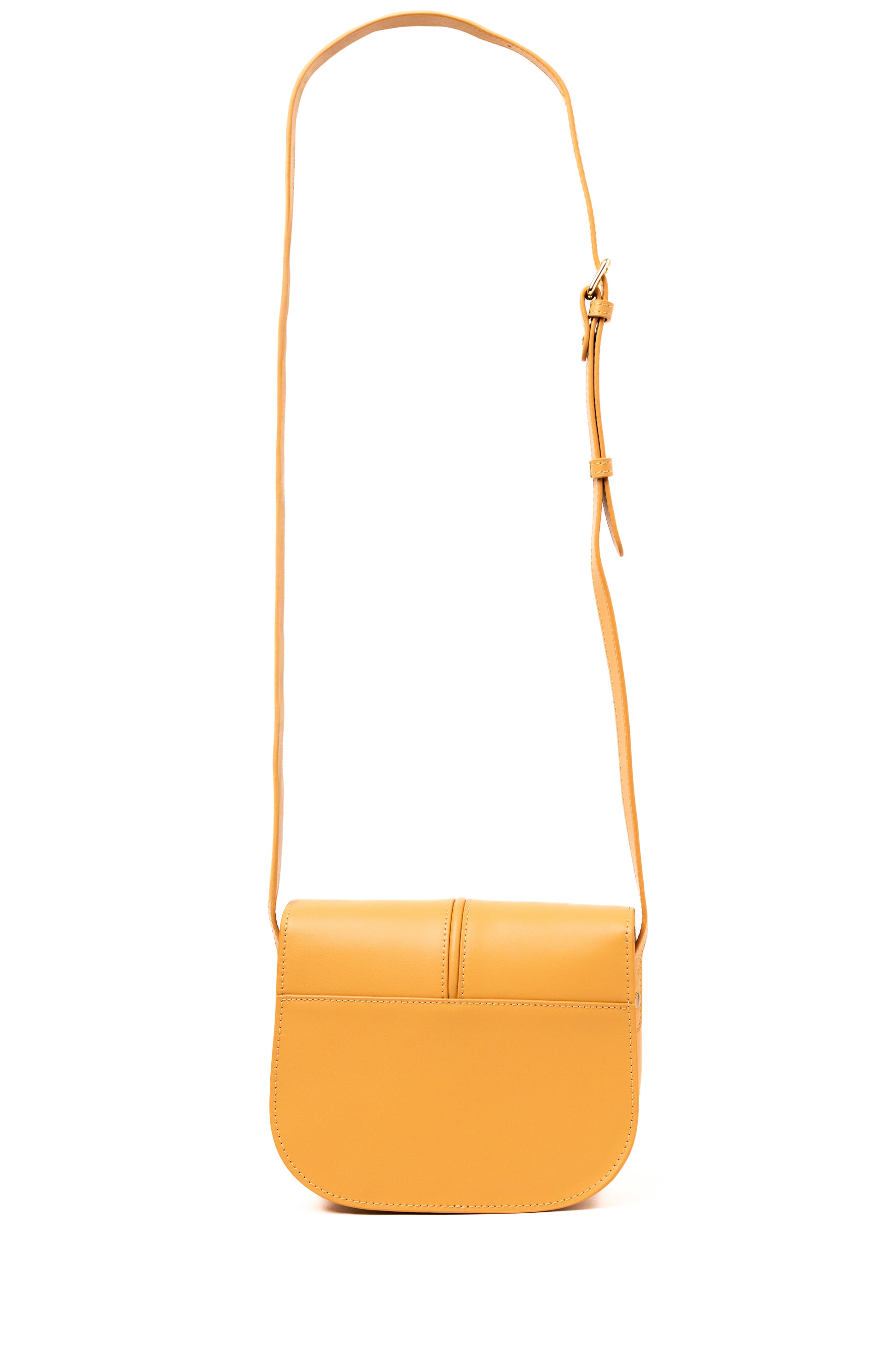 Brown leather Betty shoulder bag from A.P.C. featuring a foldover top with snap closure, an adjustable shoulder strap, an internal slip pocket and a gold tone logo.