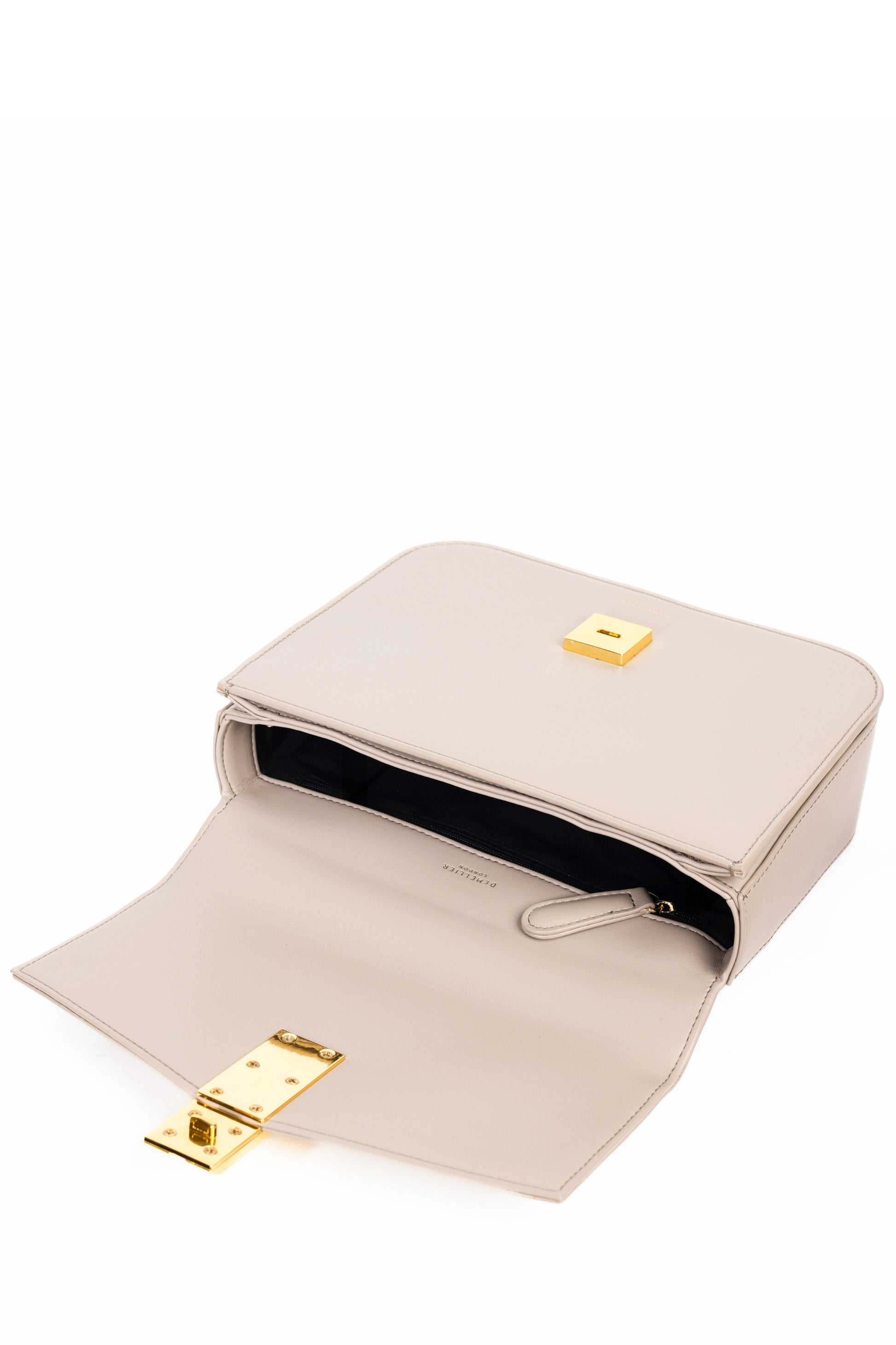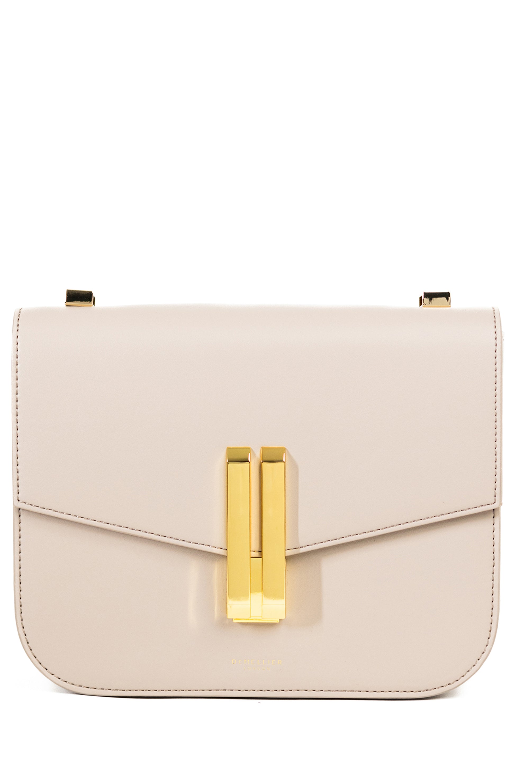 A signature silhouette for DeMellier, this structured off-white smooth Vancouver bag in flawless leather channels a luxurious mood with a sculptural, arrow-inspired gold bar clasp.